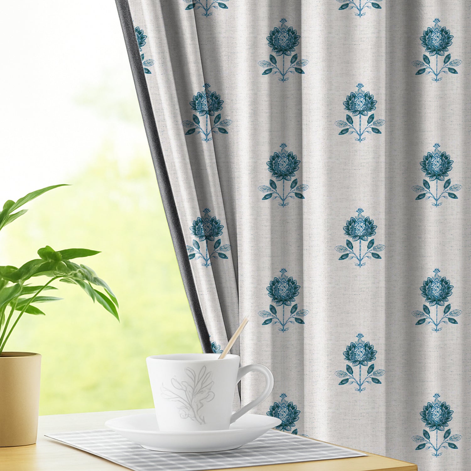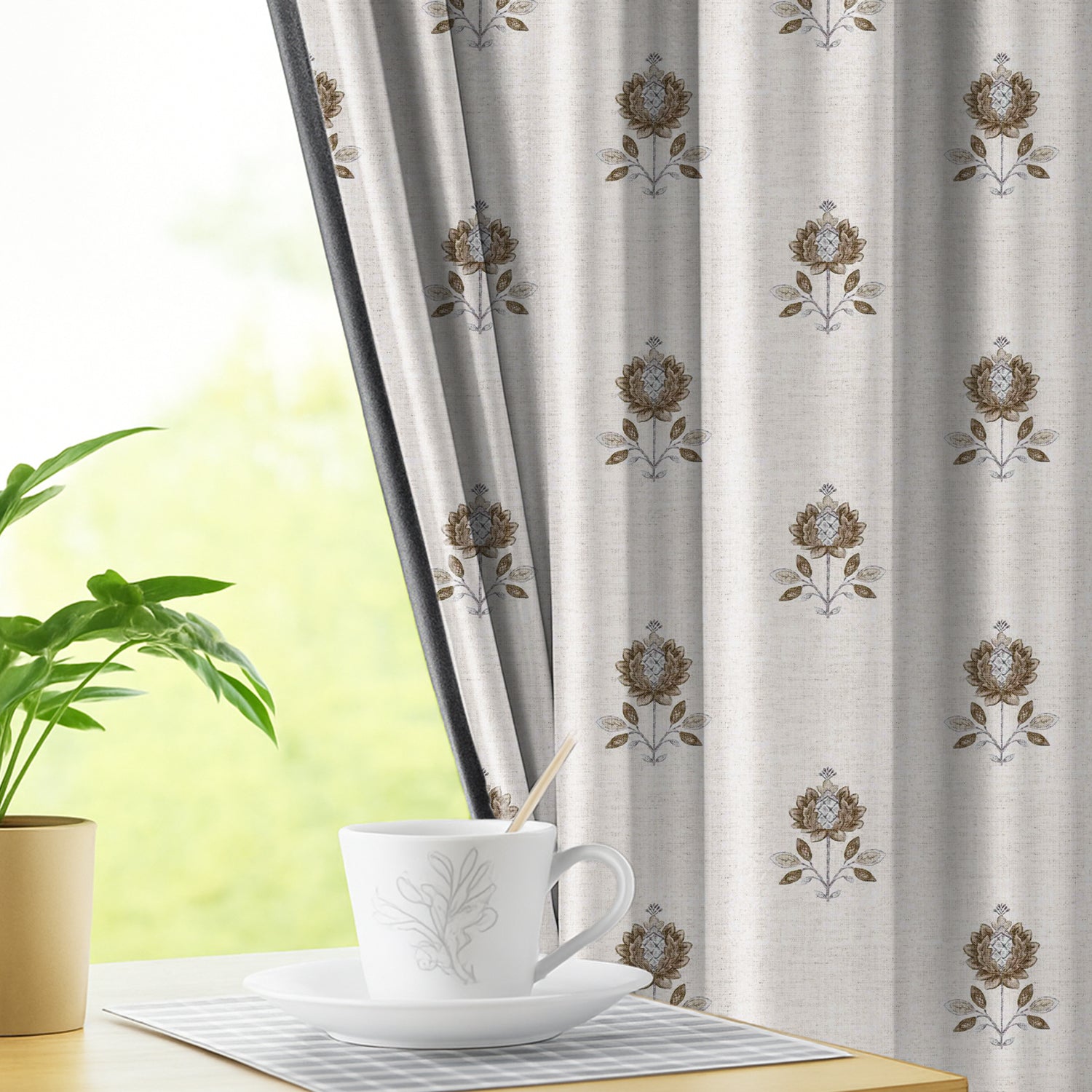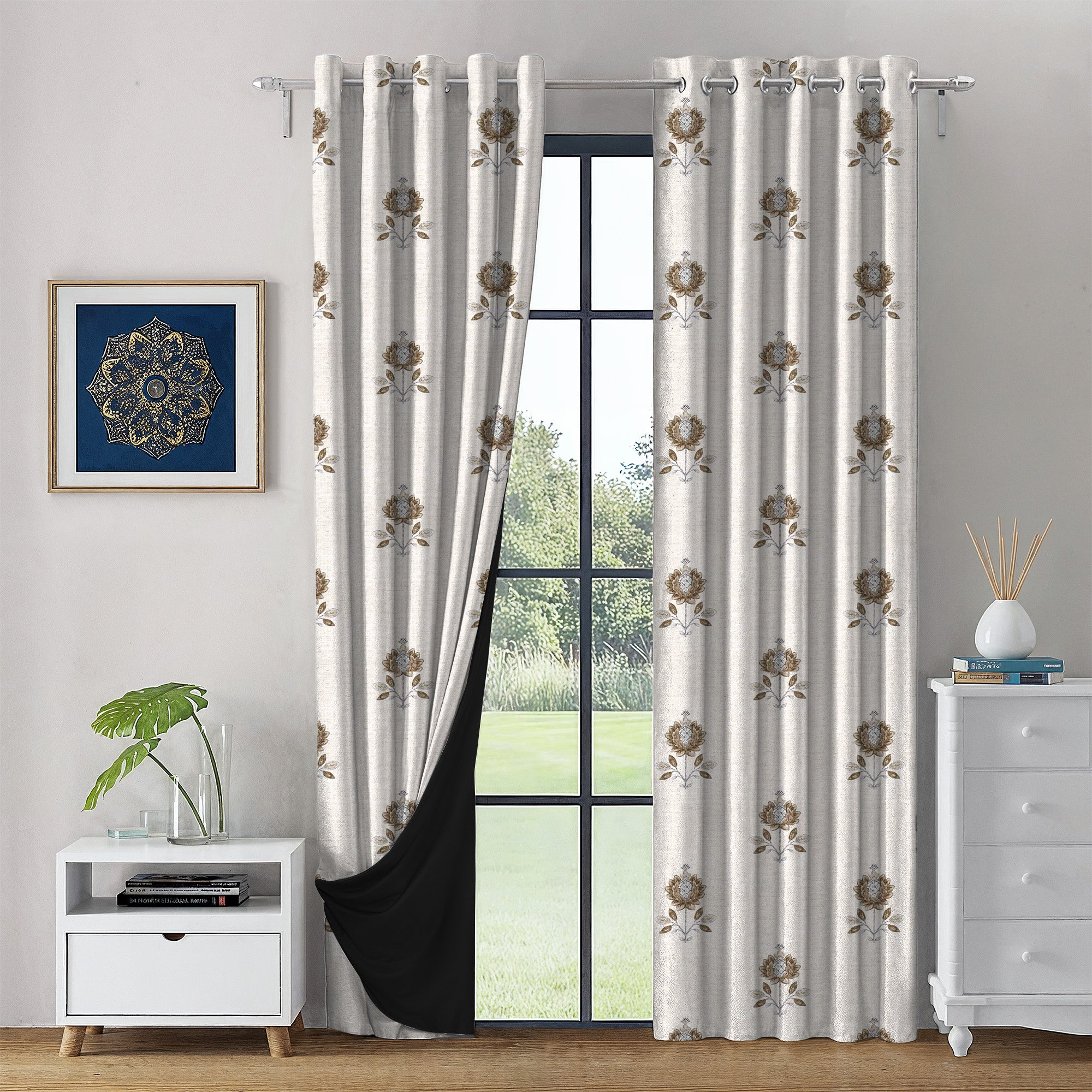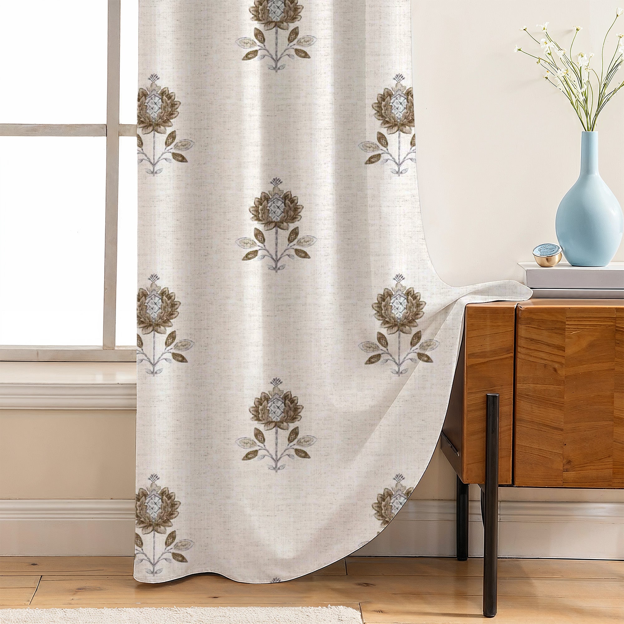 🌸 Minimalist Floral Motif Elegance – Designed with a statement single-floral motif in Blue and Brown tones, these blackout curtains bring a blend of traditional charm and modern minimalism, making them an eye-catching décor element for any room.