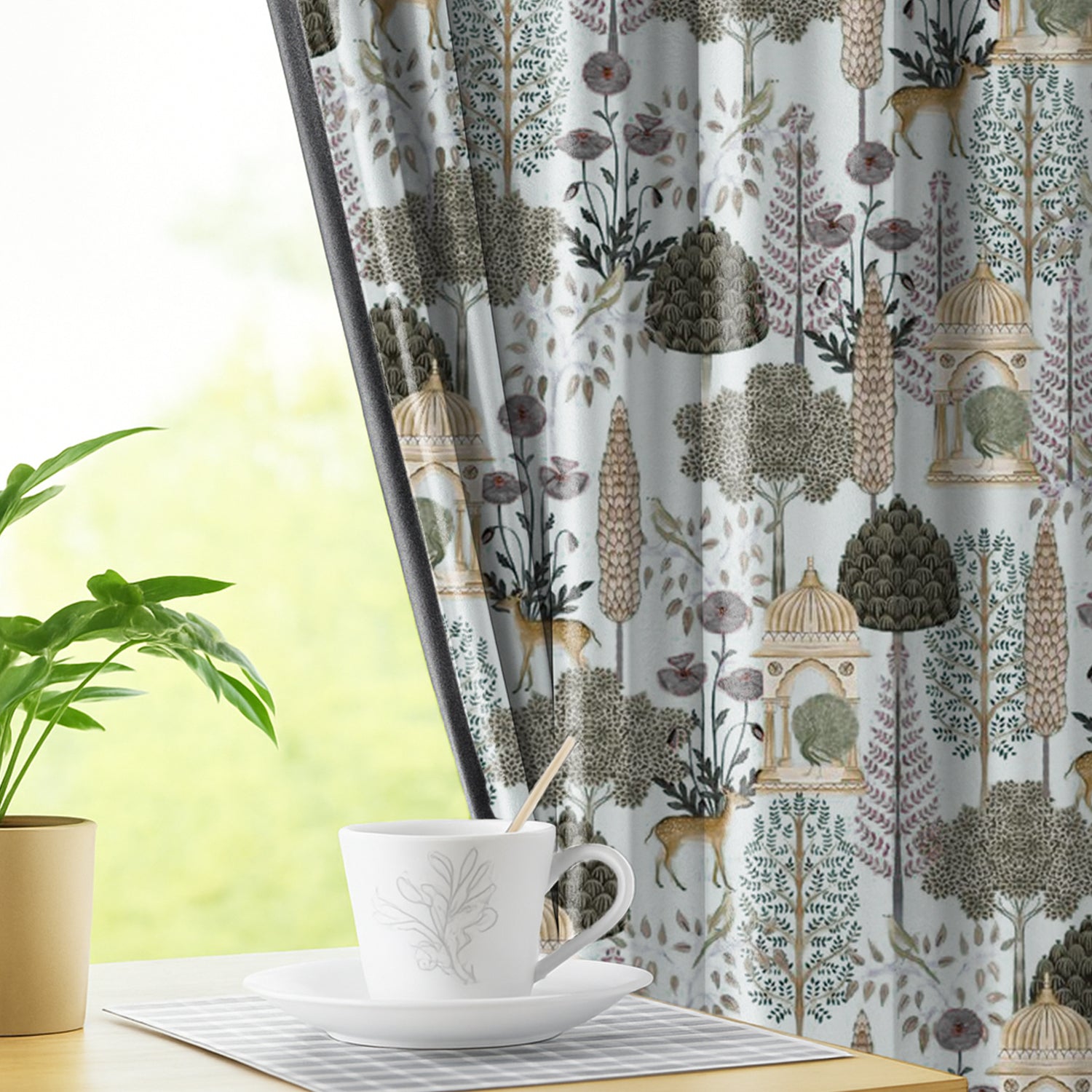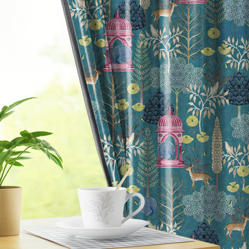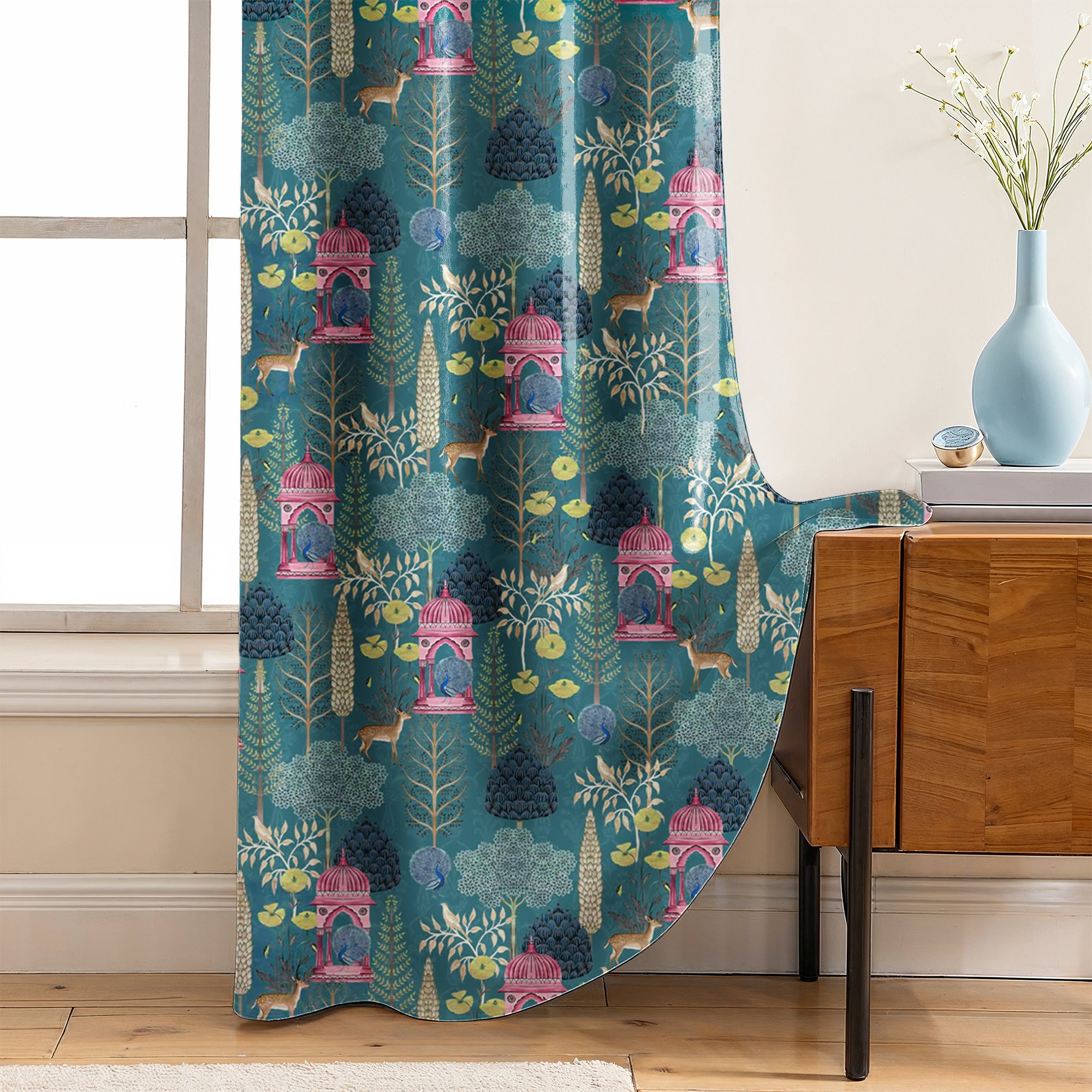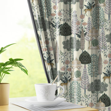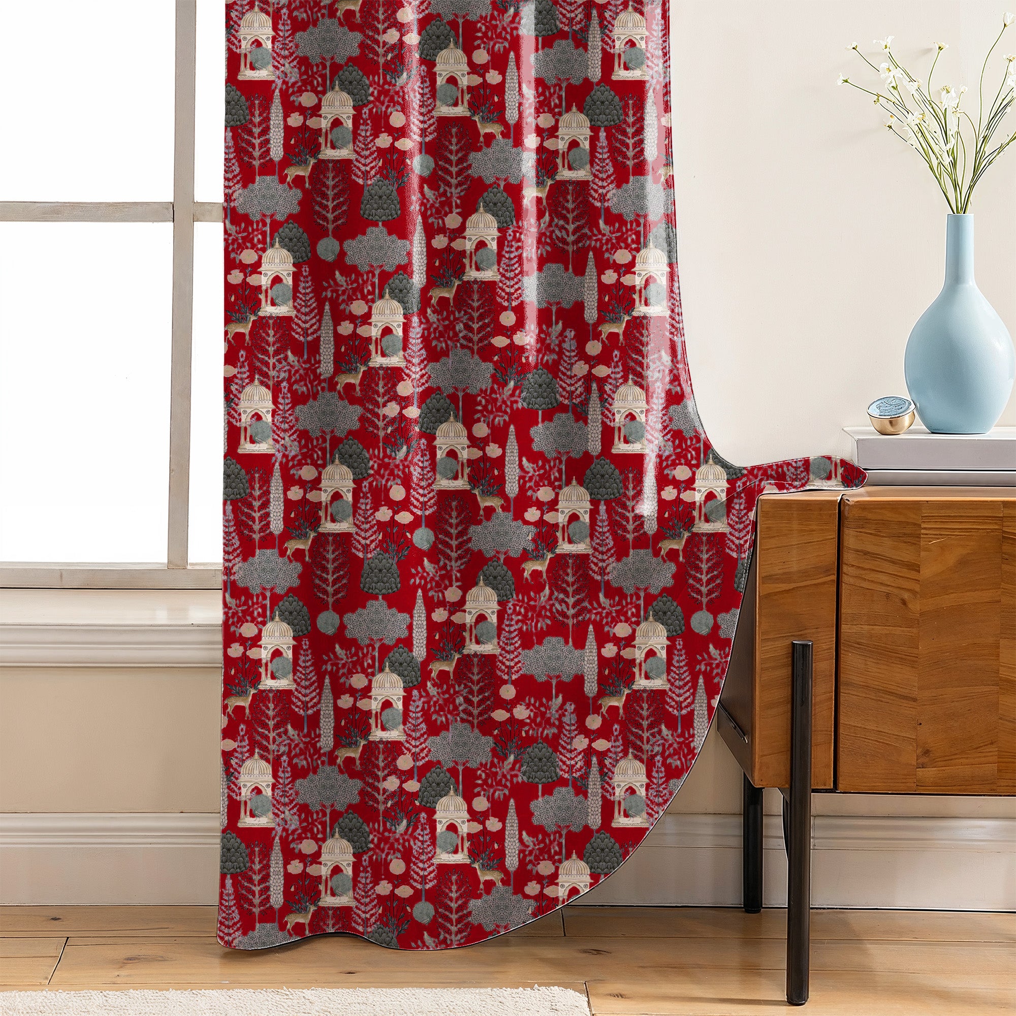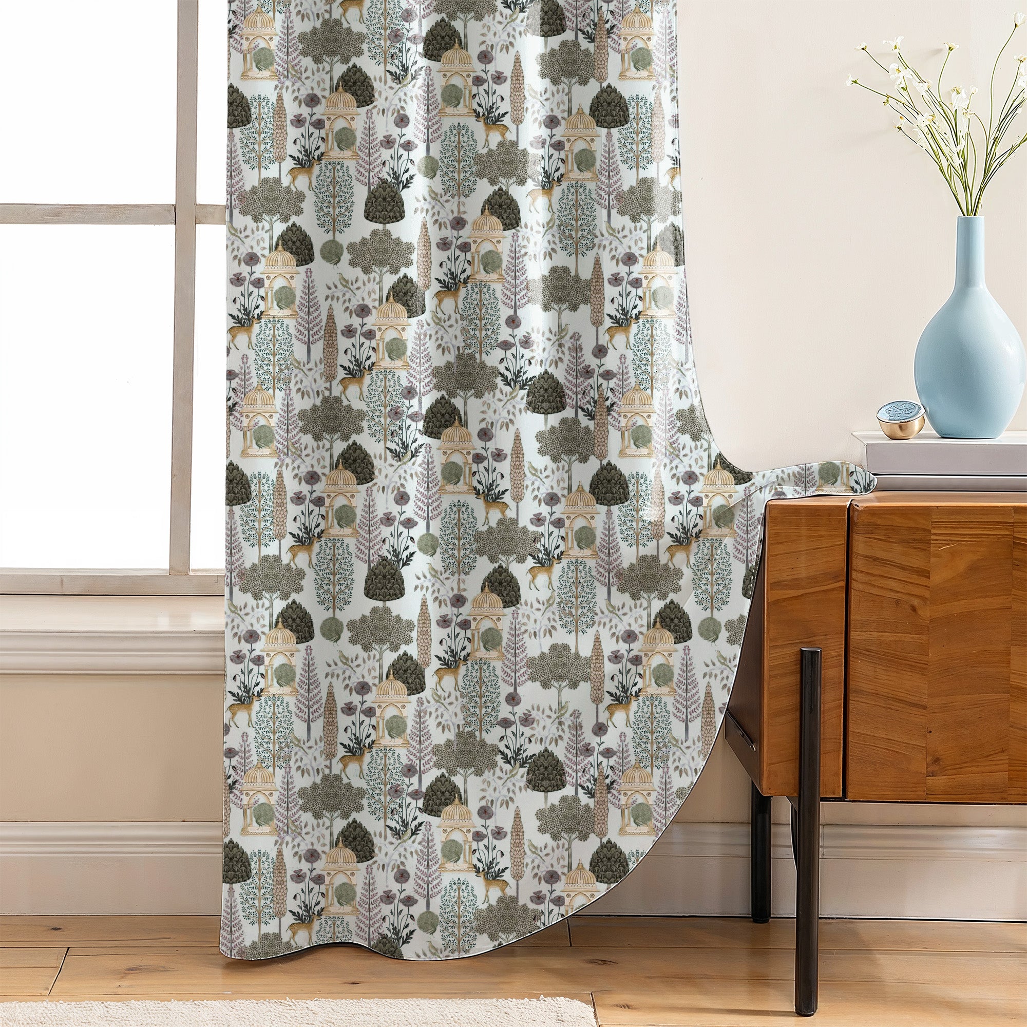 Inspired by the 400-year-old art form of Pichwai paintings from Nathdwara, Rajasthan, these curtains narrate stories of devotion, nature, and intricate temple life. The motifs of domes, trees, deer, and floral patterns bring cultural richness and museum-like artistry into modern homes.
