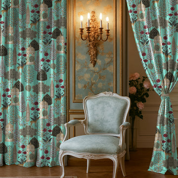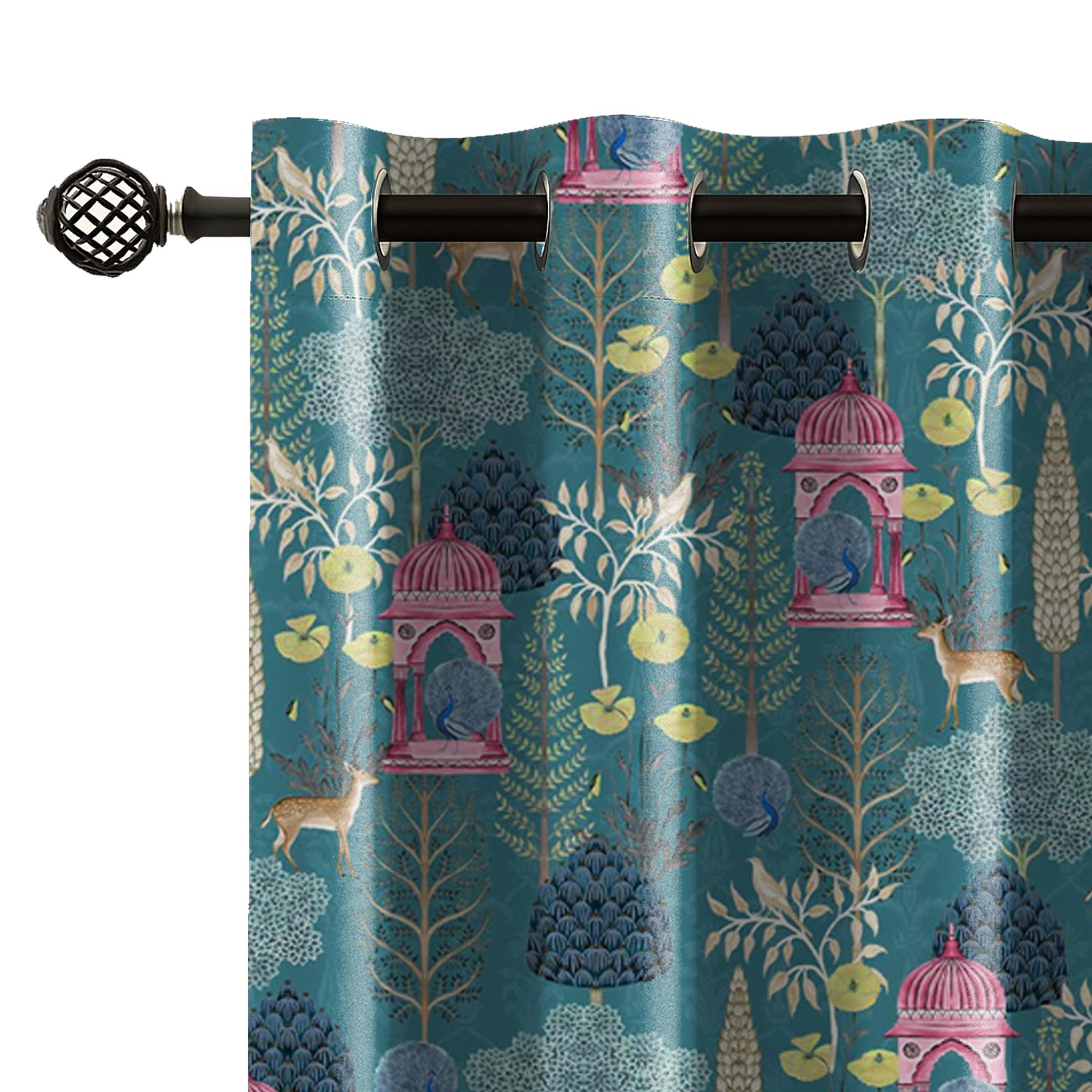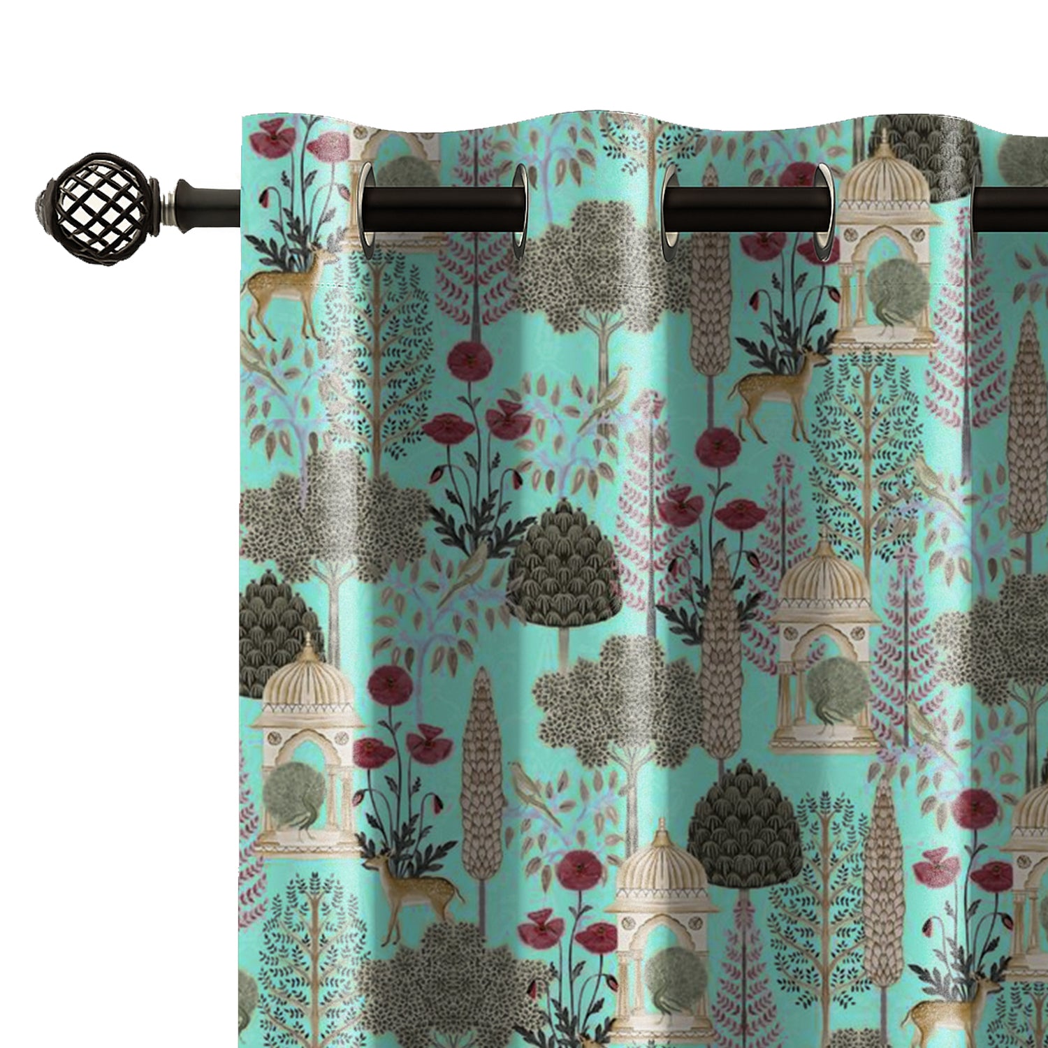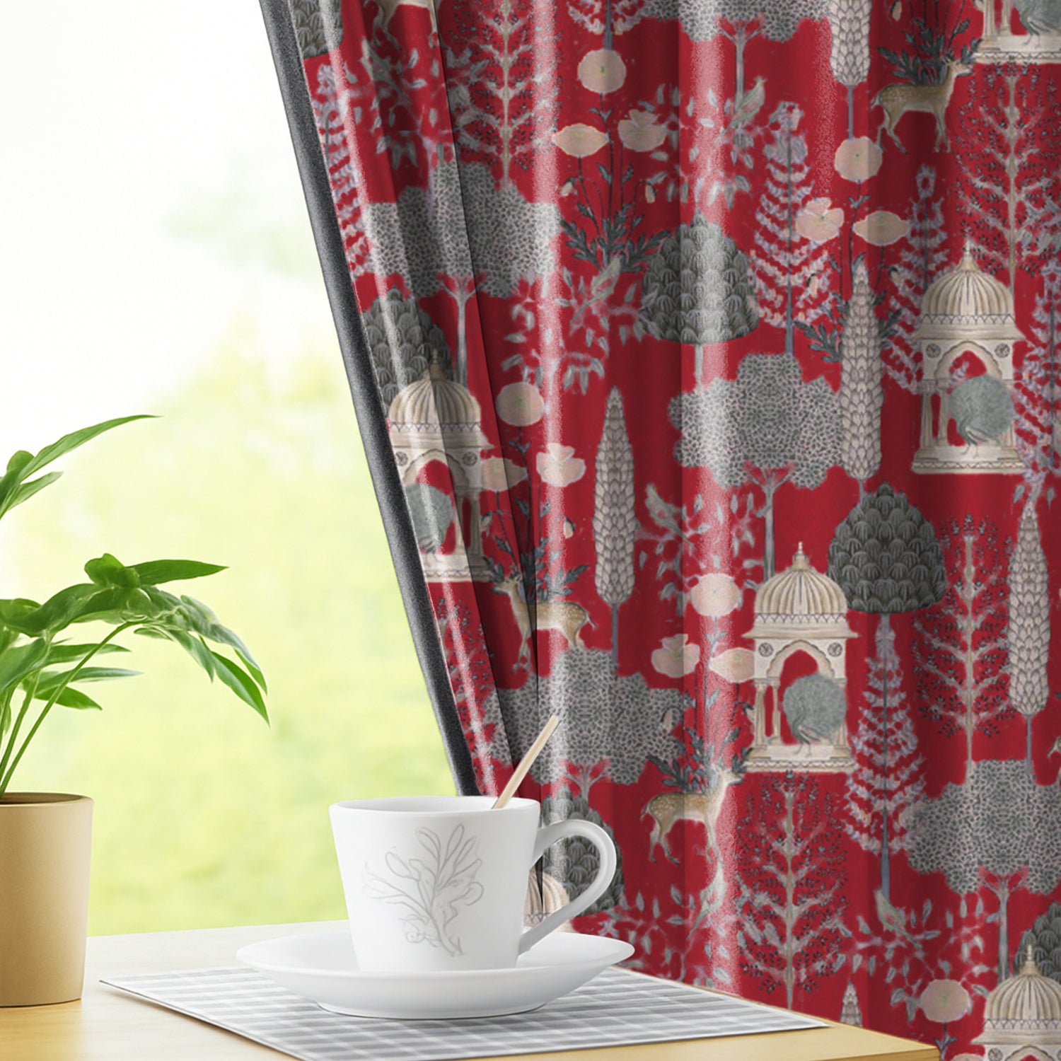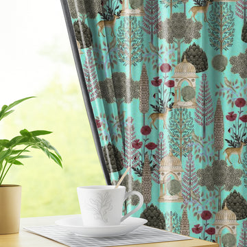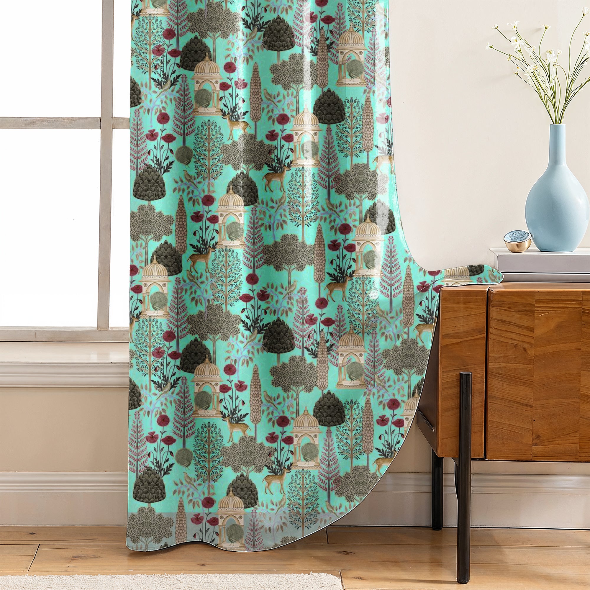 Inspired by the 400-year-old art form of Pichwai paintings from Nathdwara, Rajasthan, these curtains narrate stories of devotion, nature, and intricate temple life. The motifs of domes, trees, deer, and floral patterns bring cultural richness and museum-like artistry into modern homes.