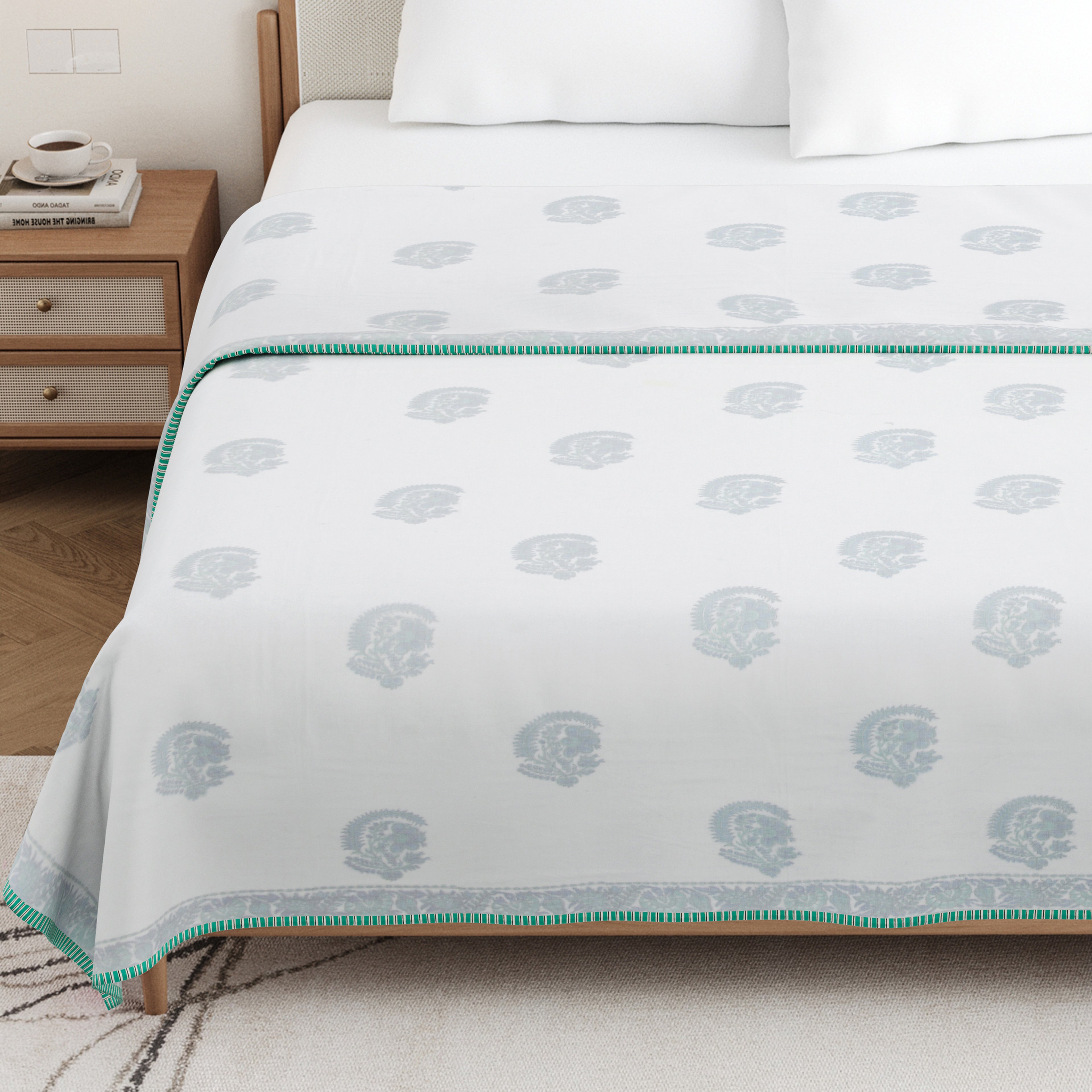 🤍 Elegant White Reversible Design – Both sides feature a crisp white base with handblock detailing, offering a minimal yet luxurious look that blends effortlessly with any home décor style.