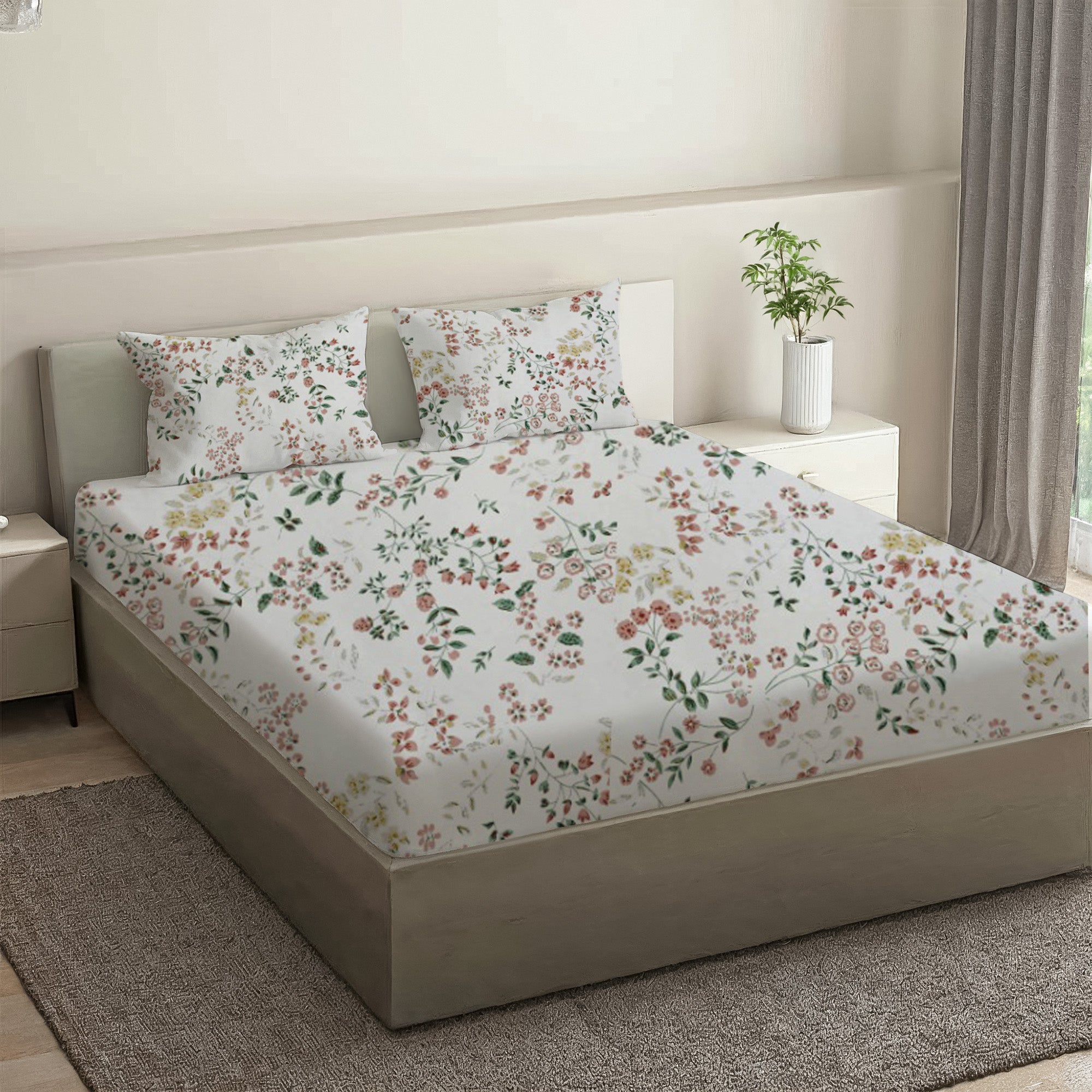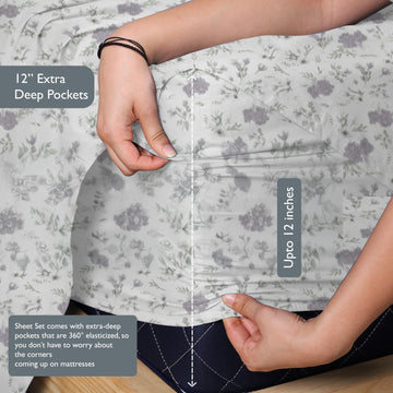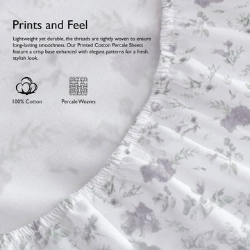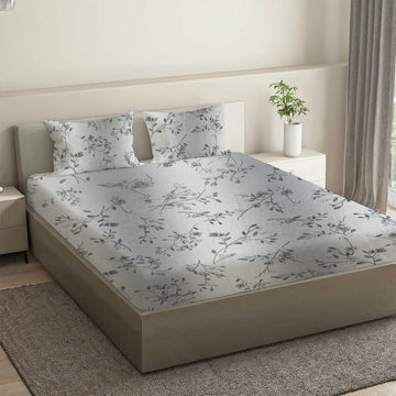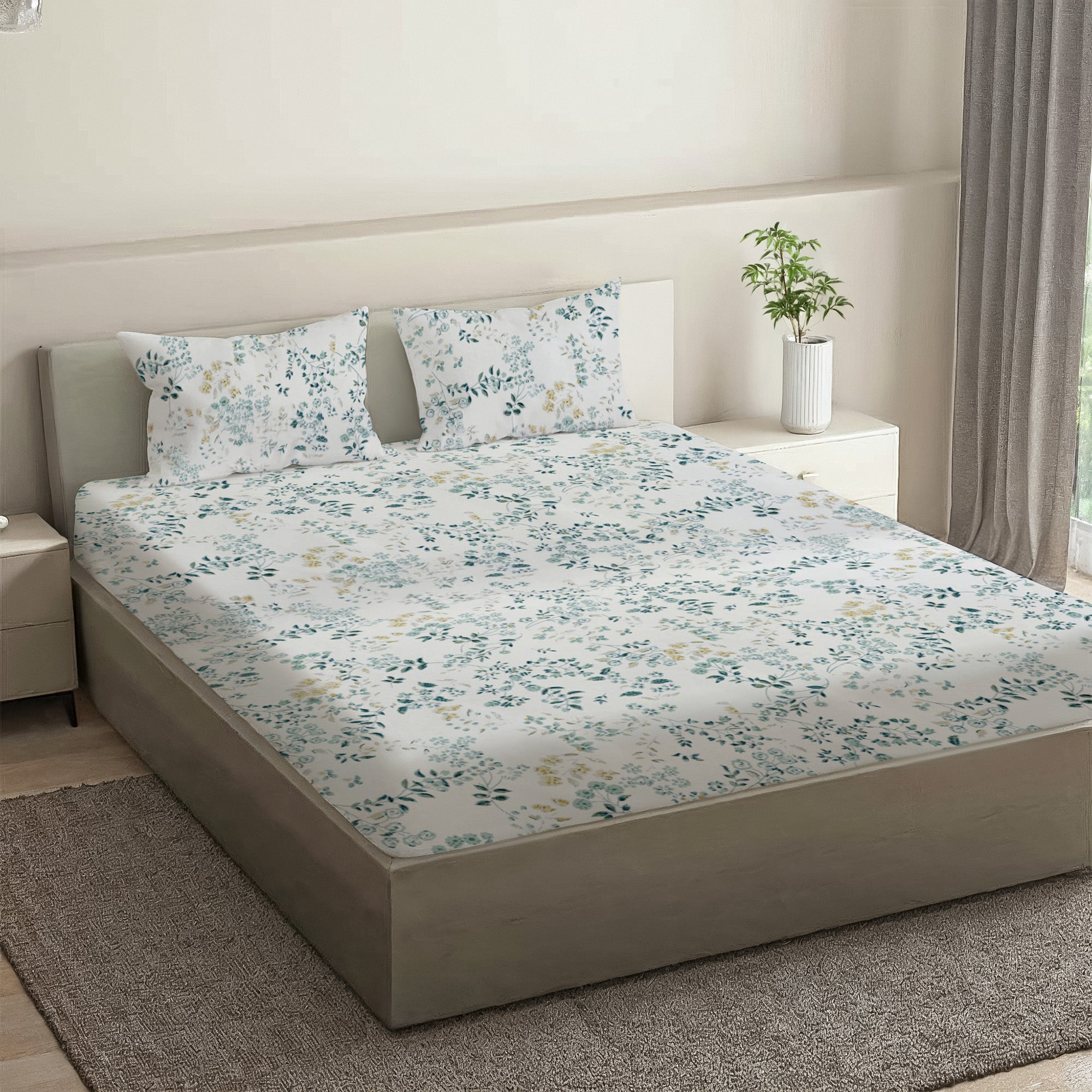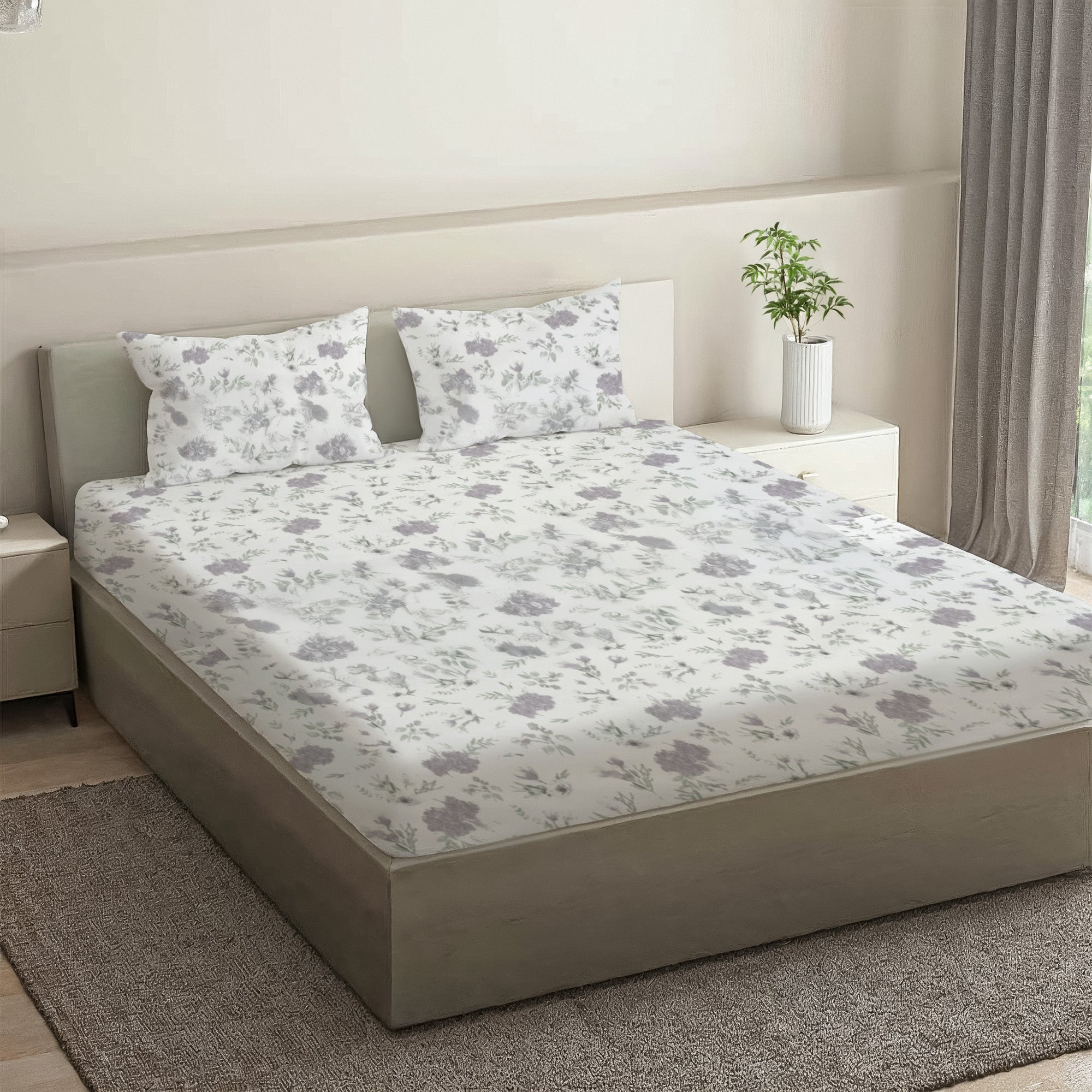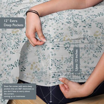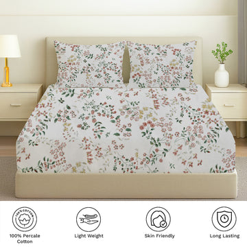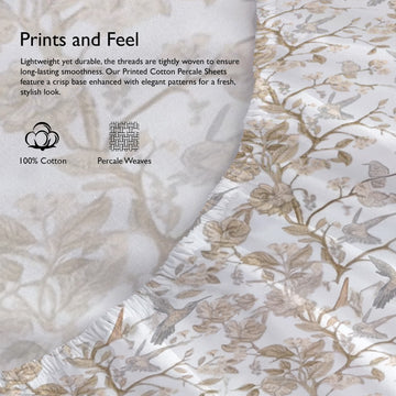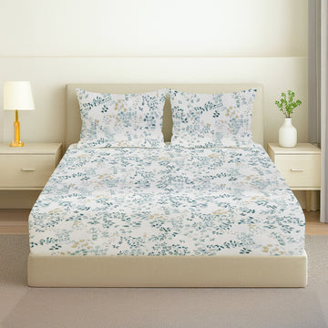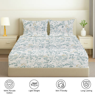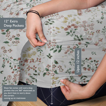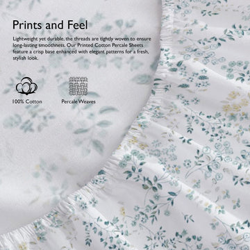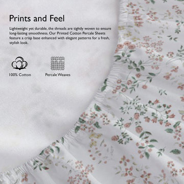Printed Cotton Percale Fitted/Elasticated Bedsheet | Floral All-Around Elastic Deep Pocket Bedsheet with Matching Pillow Cover | 300 TC | Soft, Breathable, Luxury Bedsheet