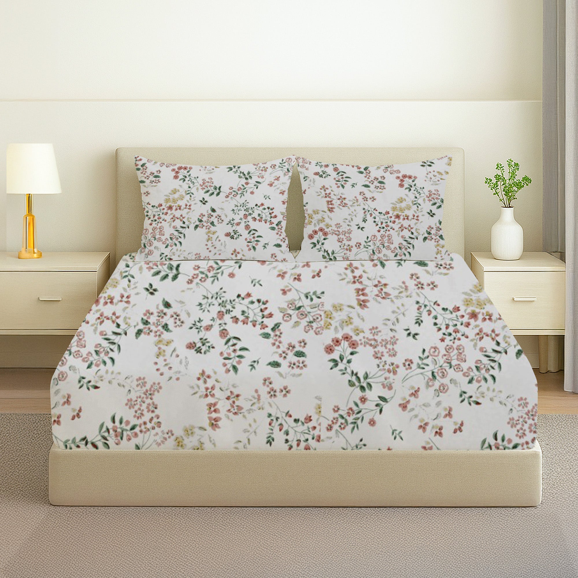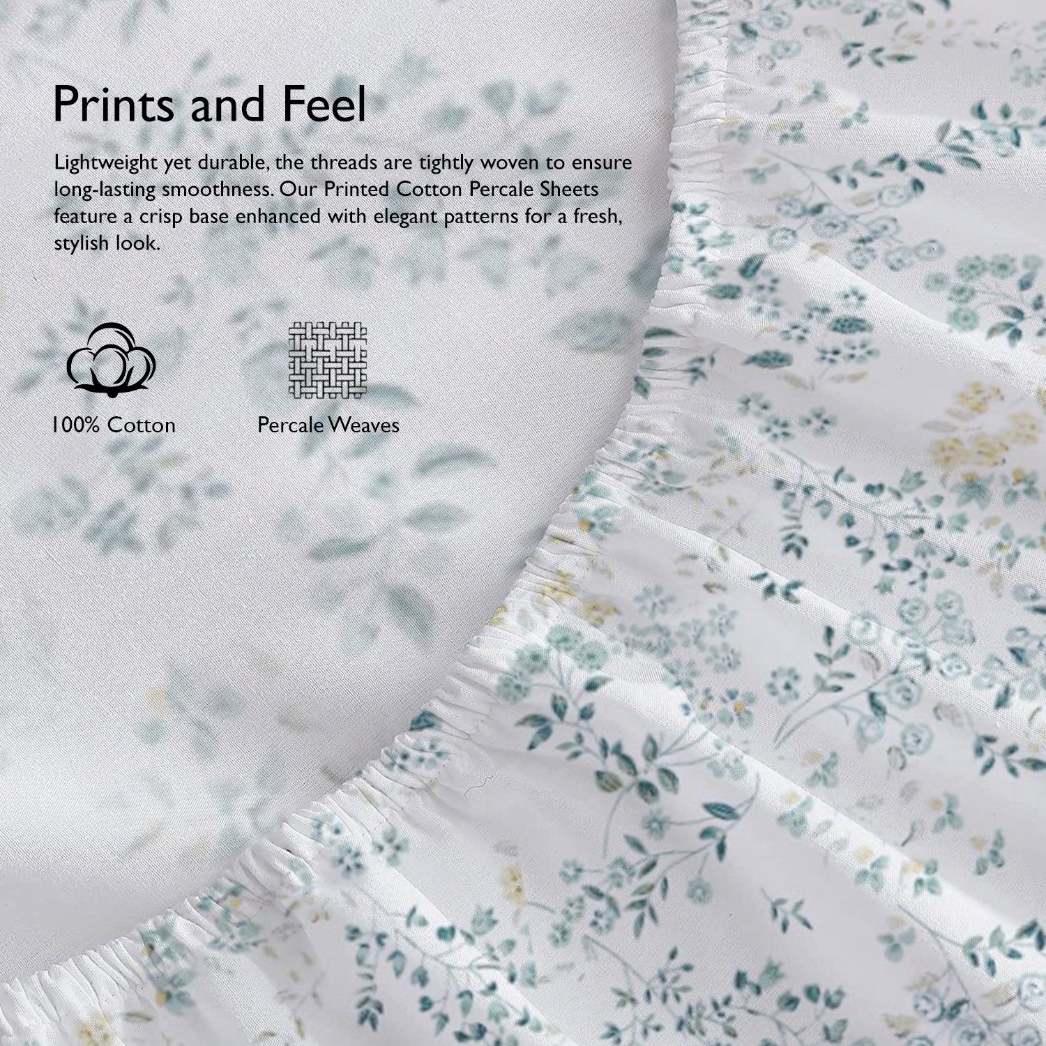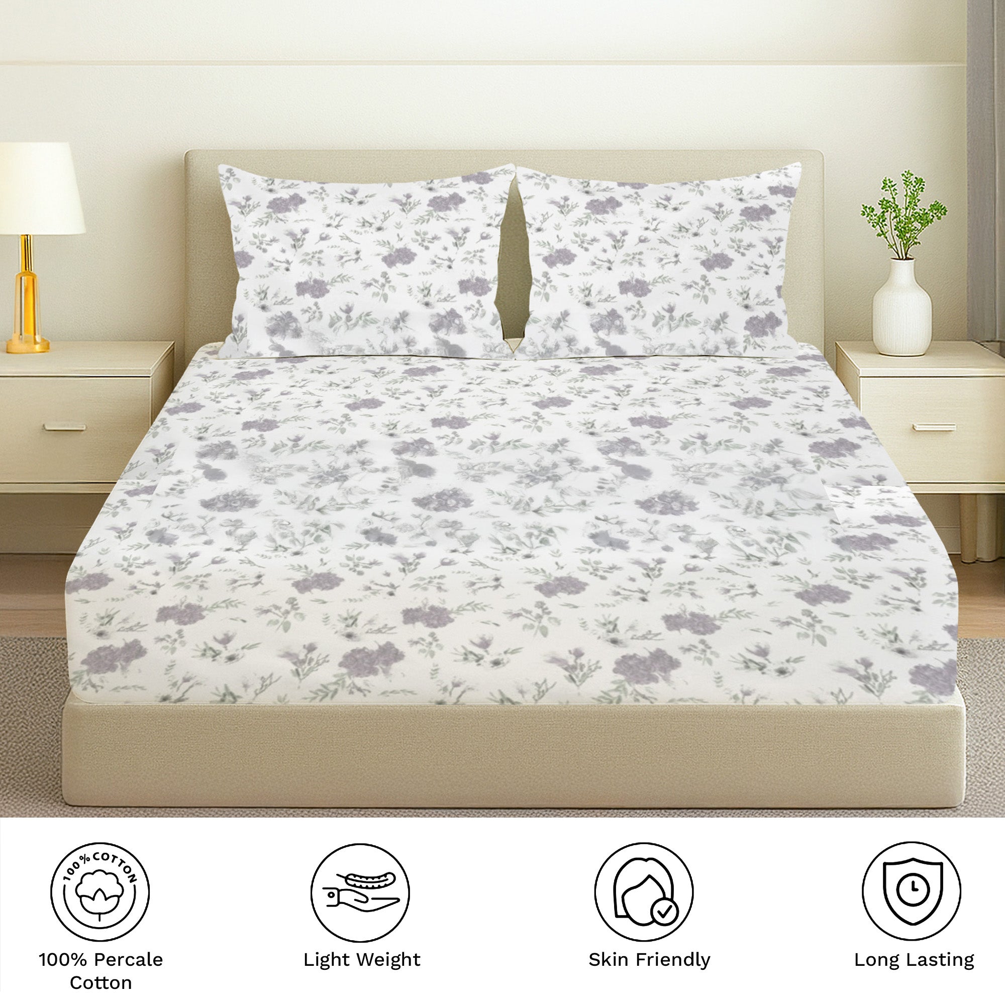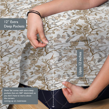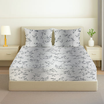 Printed Cotton Percale Fitted/Elasticated Bedsheet | Floral All-Around Elastic Deep Pocket Bedsheet with Matching Pillow Cover | 300 TC | Soft, Breathable, Luxury Bedsheet