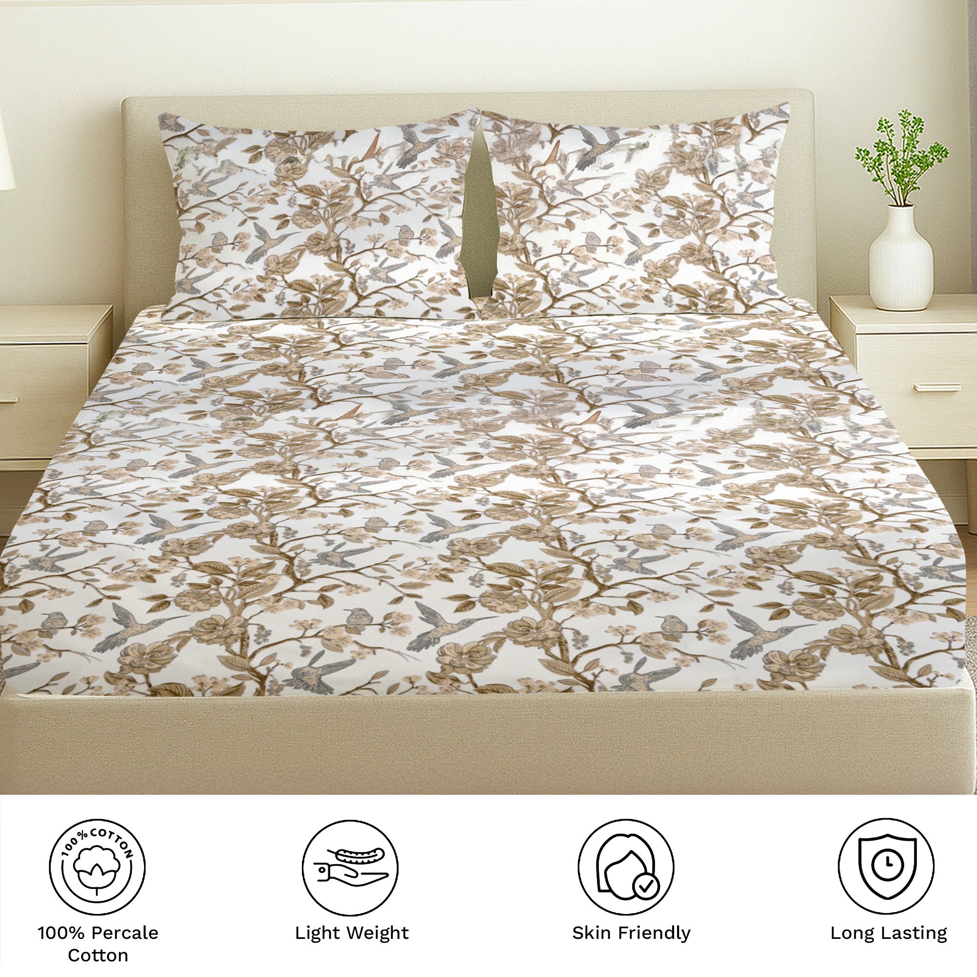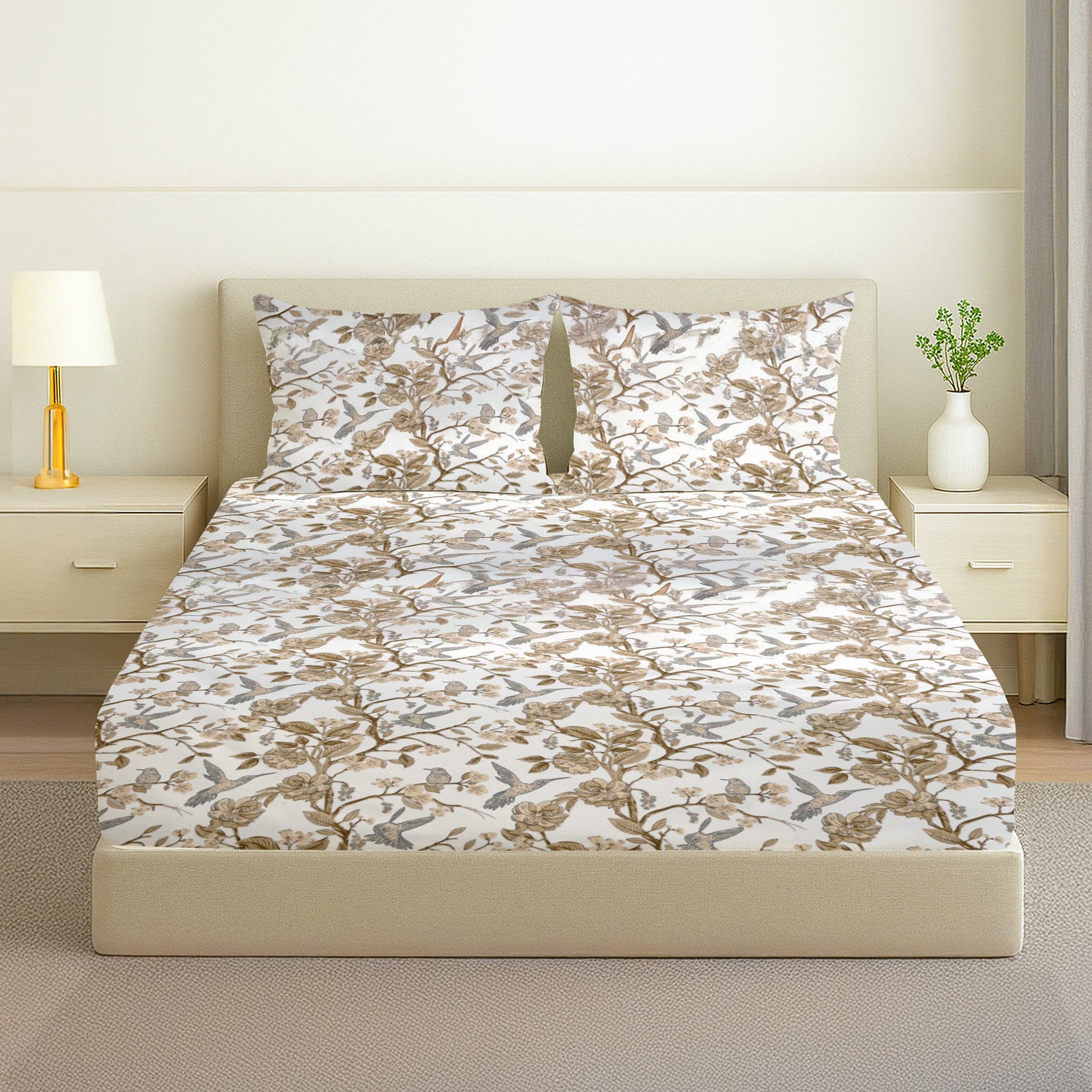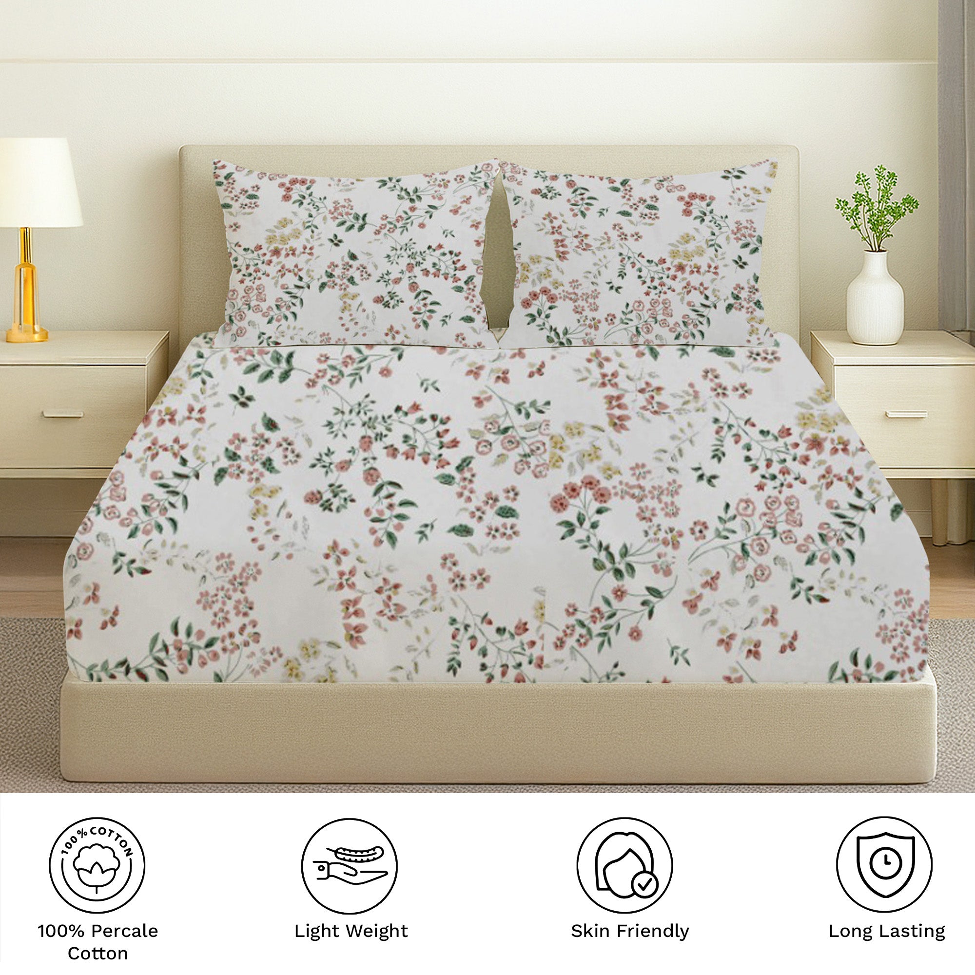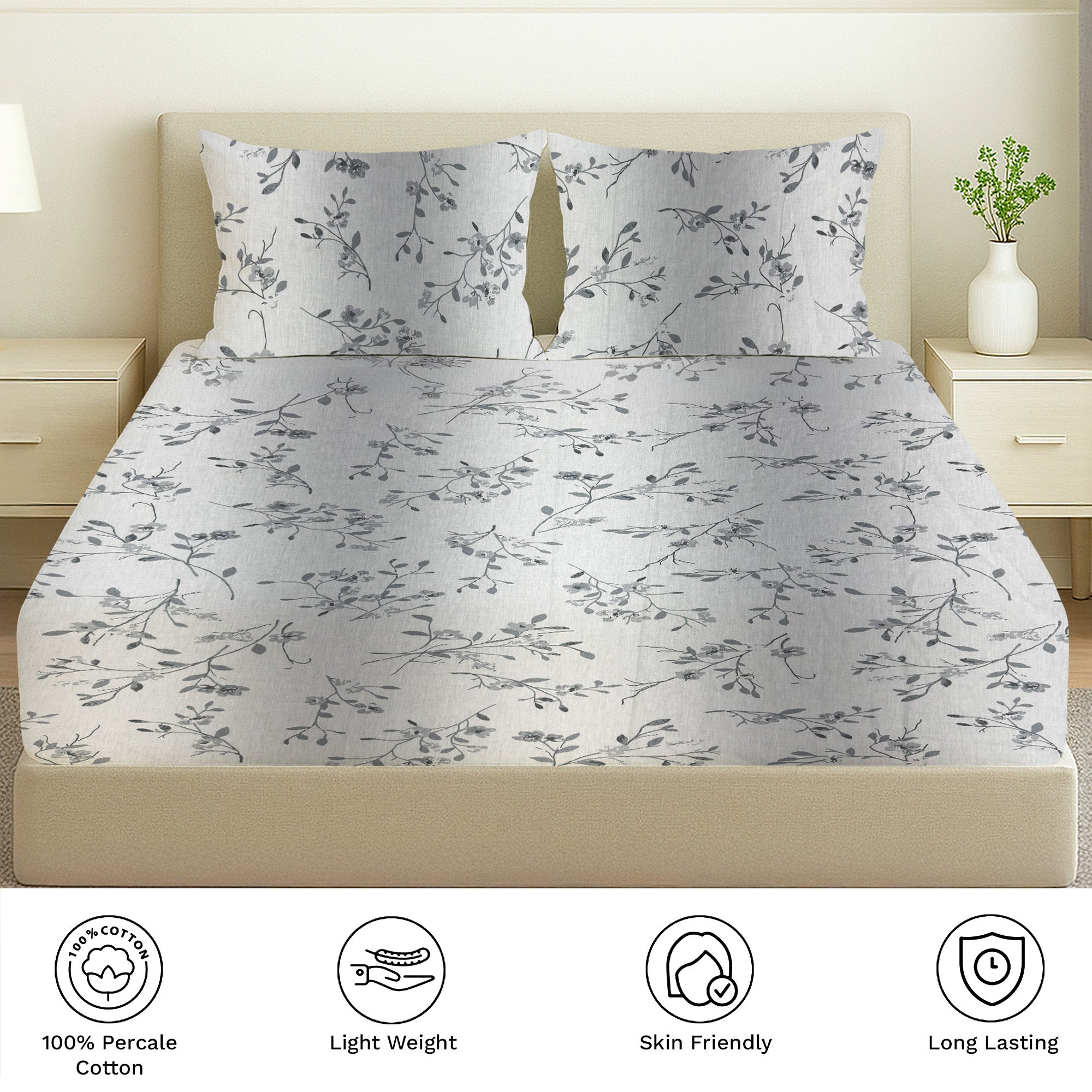 Printed Cotton Percale Fitted/Elasticated Bedsheet | Floral All-Around Elastic Deep Pocket Bedsheet with Matching Pillow Cover | 300 TC | Soft, Breathable, Luxury Bedsheet